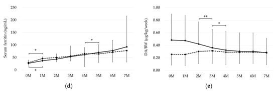 On the other hand, serum ferritin showed a significant increase in both groups at month 1, but thereafter a significant increase was only observed at month 5 in the responder group, and the change over time was not different between the two groups (p = 0.72, Figure 1d). DA per body weight showed a significant decrease at month 3 and 4 in the effective group, but a slight increase in the non-responder group, and the change over time was also significantly different between the two groups (p < 0.001, Figure 1e).