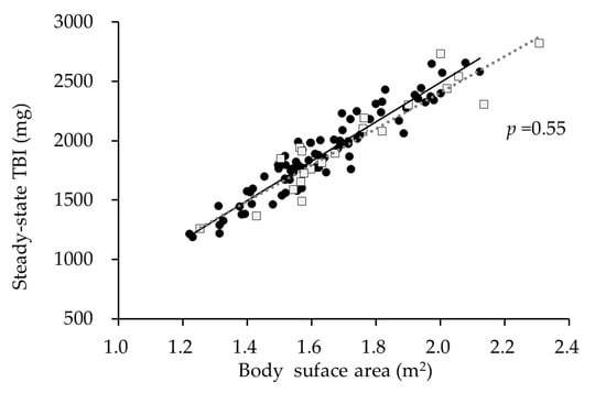 Among the 105 courses of iron replacement therapy, TBI achieved a steady state in 104 courses and was persistently elevated in only 1 course. Steady-state TBI did not correlate with Hb or serum ferritin but was strongly correlated with body surface area (BSA) [TBI = −791.914 + 1628.606 × BSA (m2); R2 = 0.88, p < 0.001, Figure 2]. The correlation between steady-state TBI and BSA did not differ between iron-therapy responders and non-responders (p = 0.55; Figure 3).