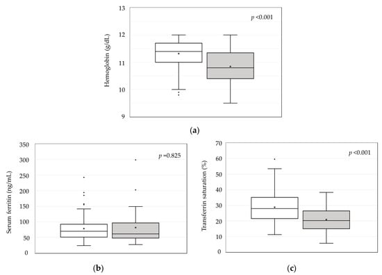 Hb levels were significantly higher in iron-therapy responders than in non-responders (11.3 ± 0.5 vs. 10.8 ± 0.6 g/dL, p < 0.001; Figure 4a). Serum ferritin levels did not differ between iron-therapy responders and non-responders (Figure 4b). TSAT was significantly higher in iron-therapy responders than in non-responders (28.7 ± 10.0% vs. 20.8 ± 7.7%, p < 0.001; Figure 4c).