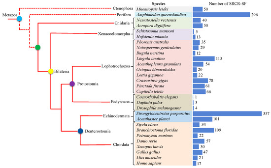The distribution of members of the SRCR-SFs in 29 representative animal species across metazoans. The colors of species represent different phyla. The red cladogram on the left illustrates the phylogenetic relationships between species, with dashed lines indicating the disputed phylogenetic positions of ctenophores and sponges. The blue histogram on the right chart tallies the total number of identified SRCR-SFs for each species.