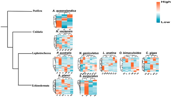 In accordance with the principles of literature reporting and species representativeness, we obtained genome, protein, and annotation files for 29 metazoans from the National Center for Biotechnology Information (https://www.ncbi.nlm.nih.gov/, accessed on 1 July 2022) [73] and the OIST Marine Genomics Unit (https://marinegenomics.oist.jp/gallery, accessed on 1 July 2022), as well as other databases. All genomes used the BUSCO v5.2.2 (https://busco.ezlab.org/, accessed on 1 July 2022) suite to assess the completeness of genomes and redundancy (Supplementary Table S2). Transcriptome data of different metazoans were retrieved from the Sequence Read Archive (SRA) (https://www.ncbi.nlm.nih.gov/sra/, accessed on 1 July 2022) database on the NCBI website using the search terms “species names” and “related issues”(Supplementary Table S8).