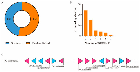 Genomic distribution analysis of sponge SRCR-SFs. (A) Proportions of clustered and individual members of sponge SRCR-SFs. Blue represents the 138 members of sponge SRCR-SFs scattered on the scaffolds; orange represents the 158 members of sponge SRCR-SFs linked in tandem array. (B) The histogram shows the tandem clusters containing 2, 3, 4, 5, 6, and 7 SRCR-SFs. (C) Gene distribution of the scaffold (NW_003546273.1) with the most SRCR-SFs in the sponge is shown. Pink represents SRCR-SFs, blue represents non-SRCR-SF genes. Numbers represent the quantity of SRCR domains encoded by a certain gene.