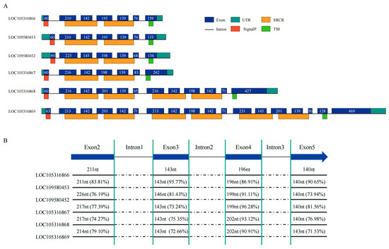 Within these tandem clusters, NW_003546273.1 stood out, housing nine SRCR-SFs (Figure 3C) segregated into two subclusters by non-SRCR genes. Our focus narrowed to the longer subcluster encompassing six SRCR-SFs: LOC105316866, LOC109580453, LOC109580452, LOC105316867, LOC105316868, and LOC105316869. The initial four genes encoded similar domain architectures with two SRCR domains, while LOC105316868 and LOC105316869 were annotated with four and six SRCR domains, respectively (Figure 4A). Notably, all SRCR domains within these six SRCR-SFs displayed relative conservation in exon–intron architecture and sequence homology. For instance, LOC105316866 and LOC109580453 shared identical exon and intron structures, with six out of seven exons exhibiting matching sequence lengths. This suggests a potential recent tandem duplication event involving these genes (Figure 4B and Figure S1).