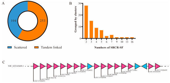 Gene distribution analysis of sea urchin SRCR-SFs. (A) The proportion of scattered and tandem linked SRCR-SFs in the sea urchin genome. Blue indicates that 104 SRCR-SFs are scattered on the scaffolds, while orange indicates that 253 SRCR-SFs are linked in tandem array. (B) A histogram showing the number of clusters containing 2, 3, 4, 5, 6, 7, 9, 10, 13 and 16 SRCR genes. (C) The gene distribution of SRCR-SFs on the scaffold (NW_022145609.1). Pink represents SRCR-SFs, blue represents non-SRCR-SF genes. Numbers represent the quantity of SRCR domains encoded by a certain gene.