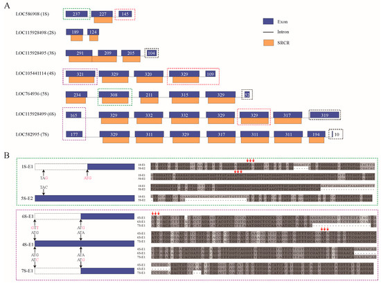 We aimed to ascertain the contribution of exon shuffling to SRCR-SF domain complexity [45]. This hypothesis was tested by identifying sibling paralogs with high sequence similarity based on the phylogenetic tree and comparing their exon–intron architectures. Widespread exon–intron structure divergence was evident within SRCR-SFs. In the sibling paralog pair LOC586908 and LOC764936, their corresponding exonic sequences exhibited significant alignment between LOC586908 exon 1 (1S-E1) and LOC764936 exon 2 (5S-E2), displaying 84% sequence similarity at the nucleotide level. An exon loss event was inferred in LOC586908, stemming from a stop codon mutation (TAC to TAG), resulting in the loss of an SRCR domain in the SRCR-SFs. A similar exon loss variation was also observed in the domain grafting of the sibling paralogs 6S-E1/4S-E1 and 7S-E1/4S-E1 (Figure 7B).