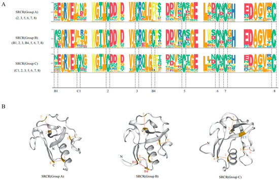 Analysis of different types of SRCR domain motifs and three-dimensional structure analysis. (A) Comparative analysis of motifs of Group A, Group B, and Group C SRCR domains. (B) Comparative analysis of the three-dimensional structures of Group A, Group B, and Group C SRCR domains. The numbers represent conserved cysteine sites.