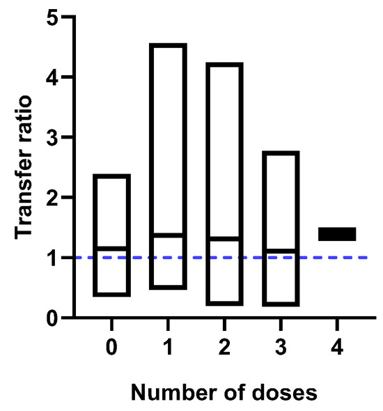2.4. Effect of the Number of Doses on Placental Transfer Efficiency