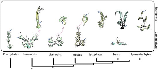 Bryophytes comprise a taxonomic group consisting of three clades of non-vascular land plants: mosses, liverworts, and hornworts [67]. It is traditionally considered that land plant traits primarily evolved in bryophytes. Liverworts were the earliest divergent clade of land plants, whereas mosses and hornworts are sister groups. However, there is only partial acceptance of the internal topology of this clade despite evidence of its monophyly [68,69]. It has been proposed that the sporophyte SAM was derived from a sterilized bryophyte sporangium, but this hypothesis remains untestable due to a lack of homologies or fossil records [70,71].