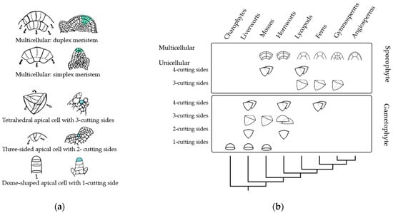 Schematic representation of the organization of different types of apical meristems (AMs) from various taxonomic groups. (a) Representation of meristem shapes and division plane of meristematic cells. From top to bottom: cross-sections of duplex and simplex meristems where divisions of the initial cells can occur anticlinally to provide length or periclinally to increase breadth. Meristems with one apical cell: a tetrahedral apical cell with three cutting sides, a three-sided cell with two cutting sides, and a dome-shaped apical cell with one cutting side. Dashed lines represent division planes, and arrows represent the directions in which the cell’s progeny is displaced during growth [34,49]. Blue cells represent stem cells, green shadowed area represents the meristematic cell or meristematic zone. (b) Schematic representation of streptophyte phylogeny based on AM anatomy through gametophyte and sporophyte life stages. Within the charophycean algae, the apical meristem is a single cell with one cutting face [51,53]. Within bryophytes, a variety of apical meristems are found, including unicellular meristems with one, two, three, and four cutting sides, as well as simple multicellular meristems consisting of two cells with eight cutting sides [50,54]. Pteridophytes and lycophytes exhibit a wide variety of SAMs; they can have one apical cell with two or three sides, a proliferative zone, and more complex multicellular meristems [55,56,57,58,59]. Large multicellular meristems occur within the seed plants. This figure shows only some common AM shapes described, while multiple shapes can occur between different species [56,60,61]. Panel (b) adapted from Niklas and colleagues [62].