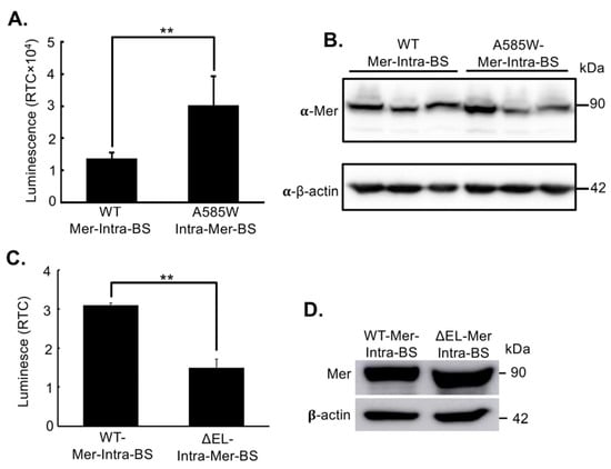 After confirming luciferase complementation and the successful construction of the Mer-Intra-BS as designed, we validated the hypothesis that luciferase complementation responds to Merlin’s change of conformational state. We first generated a mutant biosensor system that was locked into a closed conformation. Substitution of alanine (A) at position 585 with a tryptophan (W) residue (A585W) promotes interaction between Merlin’s N and C-terminus and stabilises the closed conformation of the protein [,]. Therefore, an A585W mutant biosensor system should show increased luminescent activity compared to an identical wild-type (WT) Mer-Intra-BS under the same promoter. After site-directed mutagenesis and cloning of the A585W mutant Mer-Intra-BS, we observed a significant increase in luminescent activity of the A585W biosensor compared to the WT Mer-Intra-BS (Figure 2A). This increase in luminescent activity did not correlate with the increased expression detected by Western blot (Figure 2B). Furthermore, a recent study identified the crucial role of the last two amino acids, glutamic acid (E) and leucine (L), in forming Merlin’s closed form. The Merlin mutant lacking these residues, denoted as ΔEL, adopts an open conformation [,]. To explore this phenomenon, we engineered an intramolecular biosensor for the Merlin ΔEL mutant, referred to as Mer-ΔEL-intra-BS. Compared to the wild-type (WT) control, we observed a significant decrease in luciferase activity for Mer-ΔEL-intra-BS (Figure 2C) despite similar expression levels (Figure 2D). These results provide compelling evidence that Mer-Intra-BS accurately reflects a conformational shift within living cells.