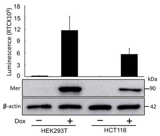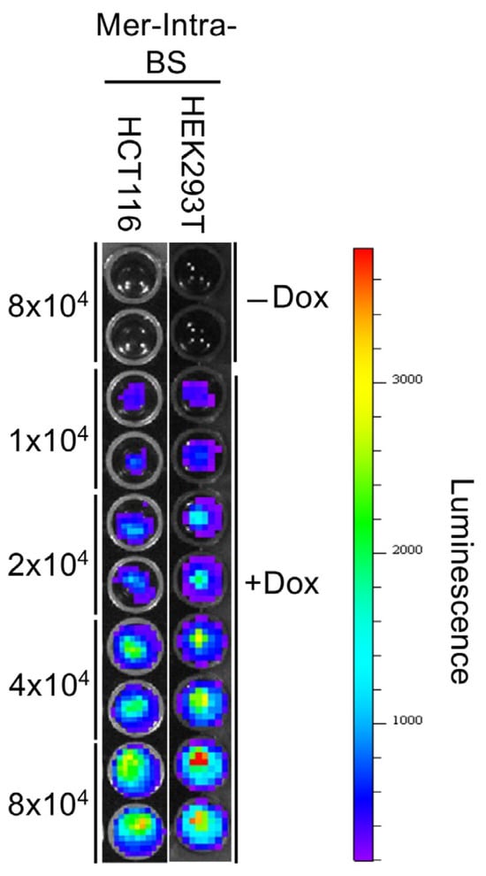 After rigorous validation, we established stable cell lines expressing Mer-Intra-BS under the control of a Dox-inducible promoter using lentiviral transgene introduction. Both HEK293T and HCT-116 cells were infected with a lentivirus carrying the Mer-Intra-BS construct. Similar to the results obtained from transient transfection luciferase assays (Figure 2), the induction of Mer-Intra-BS protein expression by Dox led to a remarkable increase in these cells’ luminescent activity (Figure 3), as indicated by the elevated levels of Mer-Intra-BS protein shown in Figure 3.
