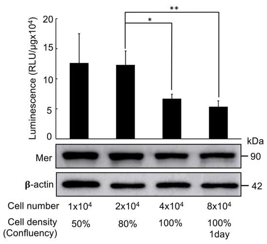 By employing these firmly established cell lines, our investigation unveiled a dynamic pattern in Mer-Intra-BS signalling. Notably, the signal intensified during cell proliferation at lower densities (1 × 104 cells, 40–50% confluency) in HEK293T cells. Despite maintaining comparable expression levels at different cell densities, after normalization of Mer-Intra-BS expression levels (Western blot analysis) by densitometry analysis using ImageJ, the signal experienced a significant reduction as cell density increased (2–8 × 104 cells, 80–100% confluency) (Figure 5).