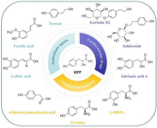 A representative aromatic compound with HPP (4-hydroxyphenylpyruvate) as a precursor in the synthesis pathway and its application diagram. Antioxidant agents: tyrosol, ferulic acid and caffeic acid; Cardiovascular drugs: Icariside D2, Salidroside, Salvianic acid A; Chemical intermediates: Tyrosine, 4-Hydroxyphenylacetic acid, L-DOPA.