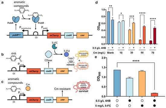 Schematic diagram of the dual selection system and model experiments of negative and positive selection. (a) The transcription factor PobR activates the pobA promoter (PpobA) when it binds to a ligand. (b) When the PpobA is allosterically activated by its native ligand 4HB, CDase is produced and converts the exogenously added nontoxic 5-FC to toxic 5-FU. (c) When the PpobA is activated by another aromatic compound, the mutant becomes Cm resistant. (d) Growth of bacteria harboring the PobRWT biosensor in medium containing different concentrations of chloramphenicol and supplied with 0.5 g/L 4HB. (e) Growth of bacteria in medium containing either 0.5 g/L 4HB or 5 mg/L 5-FC alone, or both. The OD600 was measured after 12 h of cultivation. The solid black circle means added and the hollow circle means not added. Each value represents the mean ± standard deviation from 3 biological replicates. *, p < 0.05; **, p < 0.01; ***, p < 0.001; ****, p < 0.0001.