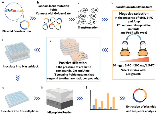 Schematic diagram of the selection procedures for ligand-responsive PobR mutants by eliminating false-positive clones, functional characterization and sequence identification. (a–c) Construction of a random PobR mutagenesis library generated by the Golden Gate Assembly system and transformed into the E. coli BW∆codA. (d) Negative selection of bacteria in the liquid medium supplemented with 4HB and 5-FC. (e) Positive selection of the bacteria was obtained by step b in liquid medium containing different aromatic compounds, including 2-PE, MA, HMA, PAld, HPP and PPA, as well as Cm. (f,g) Inoculation of selected bacteria into Masterblock followed by transfer into 96-well plates. (h–j) Determination of fluorescence intensity and altered sequences of the PobR mutants.
