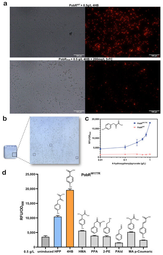 The optimal mutant PobRW177R was obtained after the dual screening. (a) The PobRWT E. coli under fluorescence microscope expressed strong fluorescence under 0.5 g/L 4HB, while the majority of the PobR-mutant E. coli showed no/weak fluorescence under the fluorescence microscope with 0.5 g/L 4HB and 200 mg/L 5-FC. (b) After two rounds of rescreening, the mutant was coated on a plate containing HPP and chloramphenicol, and some pink mono-clones were grown on the plate 12–24 h post culture. (c) Comparison of the ligand-response curves between PobRW177R and PobRWT. The vertical axis shows the ratio of mCherry (RFU) expression to E. coli growth (OD 600) measured 12 h post culture in M9 medium with different doses of HPP. (d) Fluorescence changes in PobRW177R in response treatments with different aromatic compounds (similar structure to HPP). The horizontal axis represents the ratio of mCherry (RFU) expression to E. coli growth (OD 600) measured 12 h post culture in M9 medium containing different ligands.