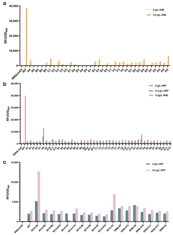 Following two rounds of negative selection of the mutants, the increased concentration of 5-FC resulted in a significantly reduced response to 4HB of the obtained PobR mutants compared to PobRWT. Fluorescence microscopy showed that the mutant strains screened under conditions of 0.5 g/L 4HB and 200 mg/L 5-FC had reduced fluorescence in the presence of 4HB (Figure 4a). Meanwhile, a negative control in the absence of any candidate ligand was used, and almost no false-positive mutant strains were discovered (Figure 5a). In particular, the expression of the mCherry correlated positively with the responsiveness of the tested PobR mutants. Therefore, only pink colonies were selected during the forward screening (Figure 4b), and candidate ligands at 0.5 g/L were used for initial identification.