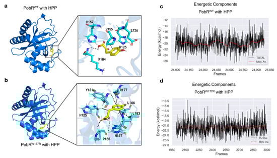 Kinetic simulation was further used to initially measure the stability of the system. As the RMSD showed (Supplementary Figure S6), PobRWT binding with 4HB was in a more stable state during the 50 ns simulation, and the overall curve did not fluctuate much. Then, MMGBSA was used to calculate the binding energy [47,48], while the binding energy of PobRW177R with 4HB increased slightly compared to PobRWT, from −18.6 kcal/mol to −17.2 kcal/mol. As for HPP, the binding energy increased from −21.64 kcal/mol to −19.98 kcal/mol (Figure 6c,d), which is consistent with our experimental results.