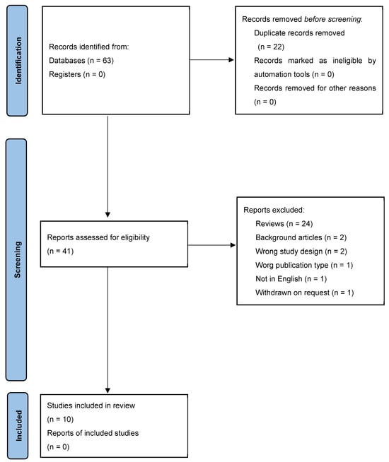 From the total of 63 research papers, 41 articles were selected after the removal of duplicates (n = 22). Of these 41 papers, after the title and abstract evaluation by two independent researchers, 24 studies were excluded because they were reviews, 2 were excluded because they were background articles, 2 were excluded because of a wrong study design, 1 was excluded because of a wrong publication type, 1 was excluded because the language was not English, and 1 was excluded because it was withdrawn at the request of the authors and/or editor. Following this screening, we found 10 papers that evaluated polyphenols’ effects on patients affected by ADHD and who were included in the final review.