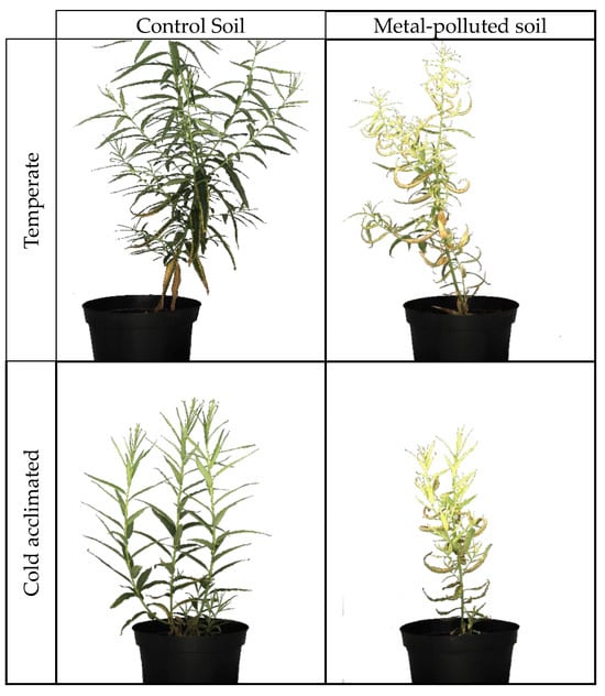 Plants exposed to the polymetallic mixture were smaller and showed a sickly habit (Figure 1). Their leaves were chlorotic, and some necrotic spots could be observed. In addition, some of the older leaves dried on the plants. Upon cold exposure, plant growth slowed down in plants cultivated in contaminated and uncontaminated soil. No further growth was observed after three weeks of cold acclimation.