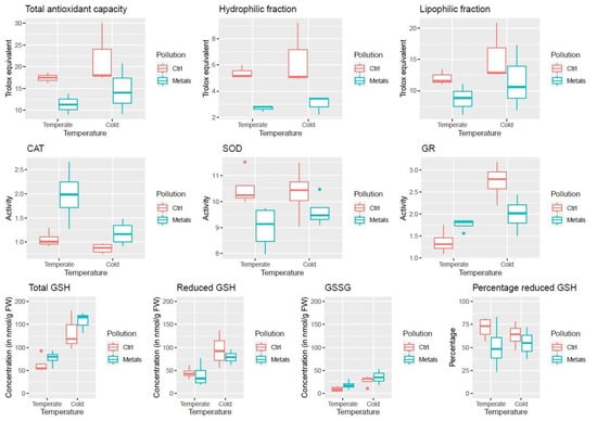 Similar results can be observed for glutathione (GSH) and oxidized glutathione (GSSG) (Figure 2, Table 1(3)). Cold acclimation significantly increases their concentration. However, while metals also tend to increase GSSG content, they have the opposite effect on GSH. Interestingly, no significant result could be observed for the ratio between oxidised and total glutathione content (Figure 2, Table 1(3)), but metals tend to decrease the percentage of reduced GSH.