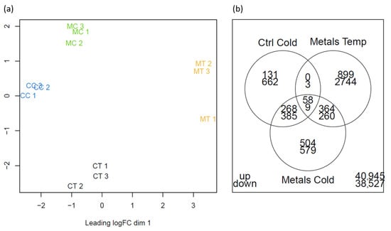 Multidimensional scaling analysis of the data resulted in a good separation of the treatments (Figure 3a). Cold acclimation and exposure to metals appeared to have a distinct effect on gene expression. Based on this analysis, the effect of exposure to both stresses generated a distinct expression profile compared to the other conditions.