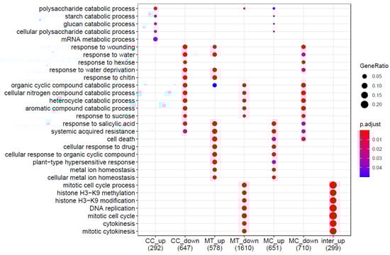 In order to identify the ontologies most involved in each condition, a gene ontology (GO) enrichment analysis was performed using clusterProfiler (v. 3.14.3 []). All three conditions of interest showed significant GO term enrichment (p < 0.05) for genes both down- and upregulated (Figure 4).
