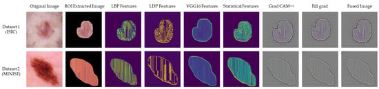 The experimental results of the GBSD-EDCNN self-feature selected optimizer are depicted in Figure 2, which illustrates the original image, adaptive region of interest (ROI) extracted image, local binary pattern (LBP), local directional pattern (LDP), VGG 16, statistical feature extracted images, Grad CAM++, Full Grad, and the fusion output images. The LBP and LDP features were extracted with a grid-based structural pattern. Here, the grid-based structural pattern takes every 3 × 3 matrix, which helps classify skin cancer using the skin lesion images. LBP has a high tolerance regarding illumination changes, and LDP is robust in noisy situations. The extraction of statistical features helps accurately classify images since the mean, median, and mode of the images are evaluated, and the images with the same values can be classified as the same class. The features extracted from VGG 16, a deep architecture, are more representative of the image content than those extracted from shallower architectures. So, the extraction of these features helps to improve the image classification of the model.