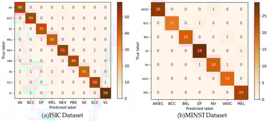 The performance analysis of the AICO self-feature selected ECNN model with TP 80 concerning the accuracy, CSI, FPR, and FNR for the datasets ISIC and MNIST is illustrated in Table 2. Figure 3a,b show the confusion matrixes for the ISIC and MNIST datasets.