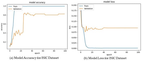 Yonis Gulzar and Sumeer Ahmad Khan [] provided a detailed comparison research of U-Net and attention-based algorithms for image lesion picture segmentation, which will assist in identifying skin lesions. TransUNet’s hybrid architecture performs better than previous benchmarking techniques in both qualitative and quantitative aspects. The TransUNet technique is resilient to noise and low contrast, but there may be interpretability issues. Sumeer Ahmad Khan et al. [] developed hand-crafted HSIFT features to classify medical images. In terms of the ability to discriminate between features while displaying category labels, the developed HSIFT feature performs better than CNN’s feature, but there are still some misclassifications. Shahnawaz Ayoub et al. [] developed a model to augment the dataset using GAN, solving the imbalanced dataset issue. However, the GAN model has difficulties regarding non-convergence and mode collapse. Hardik Nahata and Satya P. Singh [] developed a CNN model for skin cancer classification. That model shows efficient performance with a reduced cost, but the requirement for computational resources is high. Nadia Smaoui Zghal and Nabil Derbel [] created an automated approach for detecting pigmented skin lesions. Although that model’s excellent accuracy indicates its dependability, generalizability problems could arise. V. Srividhya et al. [] created a CNN model for the classification of skin lesions. Despite the method’s compelling performance in classification, misclassification still occurred. Therefore, this research proposes a deep learning model to solve the high computational time issues.