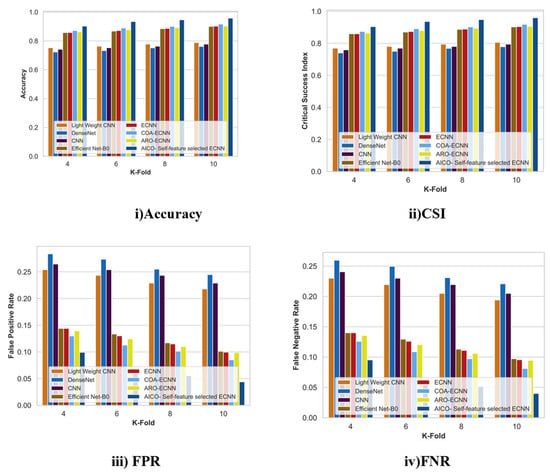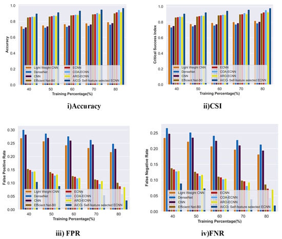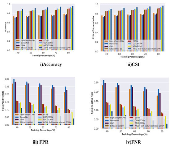 The comparative assessment of the AICO self-feature selected ECNN with the traditional approaches in terms of accuracy, FPR, and FNR for the ISIC dataset is depicted in Figure 6. The accuracy attained by the AICO self-feature selected ECNN model was 0.96, which was improved by 18.26% over lightweight CNN, 21.51% over DenseNet, 19.52% over CNN, 6.86% over EfficientNet-B0, 5.49% over ECNN, 2.43% over COA-ECNN, and 5.17% over ARO-ECNN. The AICO self-feature selected ECNN model achieved 0.97 CSI, which showed improvements of 16.54%, 19.76%, 17.8%, 6.79%, 5.43%, 2.40%, and 5.12% over the existing methods lightweight CNN, DenseNet, CNN, EfficientNet-B0, ECNN, COA-ECNN, and ARO-ECNN, respectively. The FPR value of the AICO self-feature selected ECNN model was 0.03; when compared with the conventional approaches, the FPR value was reduced due to the increased TP value. Similarly, when compared with traditional approaches such as lightweight CNN, DenseNet, CNN, Efficient Net B0, ECNN, COA-ECNN, ARO-ECNN, and AICO-ECNN, the novel AICO self-feature selected ECNN model attained an FNR value of 0.02 with TP 80, which shows that the proposed model minimizes the FPR and FNR rates with increasing TP values and thus its lower FPR and FNR values enhance the model’s classification accuracy.
