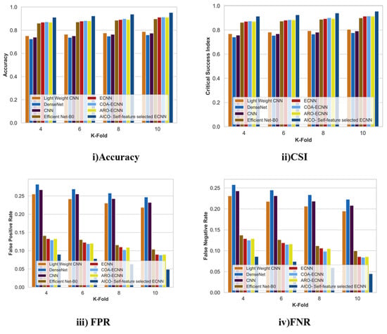 Figure 9 displays the comparative analysis of the AICO self-feature selected ECNN model with the ISIC dataset concerning the accuracy, CSI, FPR, and FNR with k-fold value 10. The percentage improvement for accuracy with k-fold 10 over the conventional techniques showed that the AICO self-feature selected ECNN improved the accuracy of the classification model. The AICO self-feature selected ECNN attained 0.95 accuracy, which showed an improvement over lightweight CNN, DenseNet, CNN, EfficientNet-B0, ECNN, COA-ECNN, and ARO-ECNN by 17.29%, 20.24%, 18.79%, 5.76%, 4.28%, 4.12%, and 4.28%, respectively. The CSI value attained by the AICO self-feature selected ECNN model was 0.95, which is far better than the conventional techniques. The CSI improvement percentage over lightweight CNN was 15.67%, DenseNet was 18.62%, CNN was 17.08%, Efficient Net-B0 was 5.74%, ECNN was 4.27%, COA-ECNN was 4.11, and ARO-ECNN was 4.27%. The respective FPR and FNR values of the AICO self-feature selected ECNN model were 0.044 and 0.048, which shows that the proposed model produces more minimum FPR and FNR values than the existing methods.