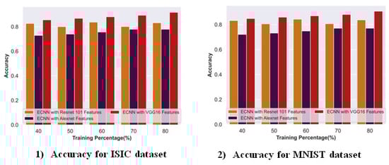 Figure 10 depicts the ablation study of the pre-trained VGG-16 model with other feature extraction techniques for accuracy with the ISIC and MNIST datasets. For the ISIC dataset, the accuracy rate attained by ECNN with VGG 16 was 0.91 with TP 80 when compared with the conventional ResNet 101 and AlexNet models. The VGG 16 feature extraction models improved by 9.24% and 15.00%, respectively. Similarly, for the MNIST dataset, the ECNN with VGG 16 model achieved a 0.90 accuracy rate, which showed a 7.66% improvement over ResNet 101 and 15.01% over the AlexNet feature extraction model.
