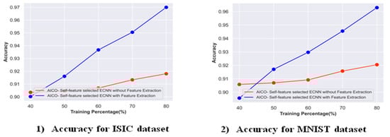 Figure 11 depicts the ablation study on the AICO self-feature selected ECNN with and without feature extraction in terms of accuracy for the ISIC and MNIST datasets. For the ISIC dataset, the accuracy attained by the proposed model with feature extraction was 0.96 with TP 80. When compared with the AICO self-feature selected ECNN without feature extraction, the proposed model with feature extraction obtained an improvement of 5.35%. Similarly, for the MNIST dataset, the AICO self-feature selected ECNN with feature extraction achieved a 0.96 accuracy, showing a 4.41% improvement over the AICO self-feature selected ECNN without a feature extraction model.
