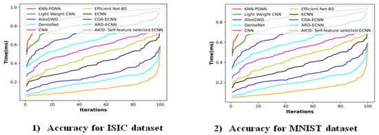 Figure 12 depicts the time complexity analysis of the AICO self-feature selected ECNN with existing methods like KNN-PDNN [], lightweight CNN [], AlexGWO [], DenseNet [], CNN [], EfficientNet-B0 [], ECNN, COA-ECNN, and ARO-ECNN. Figure 12 shows the proposed model was substantially faster than all other comparative methods, with the lowest computational time of 0.55 s at the 100th iteration. The other existing methods take a computational time of 0.99 s for KNN-PDNN [], 0.99 s for lightweight CNN [], 0.94 s for AlexGWO [], 0.87 s for DenseNet [], 0.80 s for CNN [], 0.78 s for EfficientNet-B0 [], 0.78 s for ECNN, 0.58 s for COA-ECNN, and 0.56 s for ARO-ECNN for the 100th iteration, which requires more time than the proposed method. Even though KNN-PDNN [] and AlexGWO [] attain a higher performance than the proposed method, these models require more computational time than the proposed method. So, it can be concluded that the proposed AICO self-feature selected ECNN method is more efficient than most existing methods in terms of both performance and computational time.