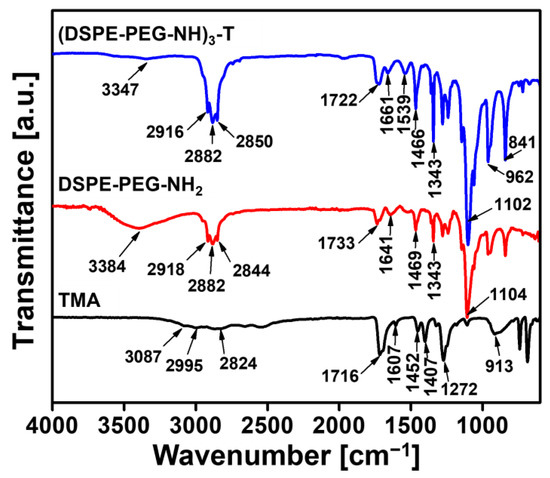 Figure 2. Fourier-transform infrared (FTIR) spectroscopic analysis of trimesic acid (TMA), 1,2-distearoyl-sn-glycero-3-phosphoethanolamine-N-[amino(polyethylene glycol)-2000] (DSPE-PEG-NH2), and synthesized trigonal-linker module, DSPE-PEG-NH branching with TMA ((DSPE-PEG-NH)3-T).