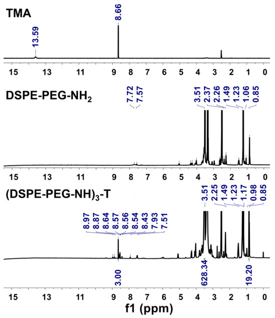 Figure 3. Proton nuclear magnetic resonance (1H-NMR) spectra of trimesic acid (TMA), 1,2-distearoyl-sn-glycero-3-phosphoethanolamine-N-[amino(polyethylene glycol)-2000] (DSPE-PEG-NH2), and DSPE-PEG-NH branching with TMA ((DSPE-PEG-NH)3-T). The NMR spectrum results were recorded in dimethyl sulfoxide (DMSO)-d6 solvent.