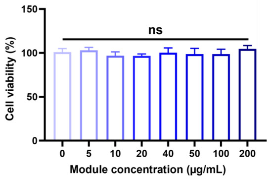Figure 4. NK cell viability with the module (DSPE-PEG-NH)3-T for 6 h. Cell viability was evaluated in NK cells with a 0~200 µg/mL concentration of the module. In the subsequent experiment, cells were treated with (DSPE-PEG-NH)3-T at a 40 µg/mL concentration. The data were expressed as mean ± standard deviation (SD) based on a triplicate measurement. (ns: not significant).