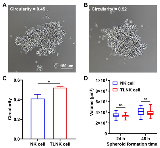 Figure 5. NK spheroid volume and morphology analysis. NK spheroid formation image at 6 h in (A) the NK cell group and (B) the TLNK cell group. (C) Cell circularity with (DSPE-PEG-NH)3-T for 6 h. (D) Volume quantification with (DSPE-PEG-NH)3-T for 24 h and 48 h. A single spheroid was made up of 5 × 103 NK cells. The area, perimeter, length, and width of spheroids were measured by ImageJ software 1.53e. Also, the spheroid circularity and volume were calculated with Formulas (2) and (3). The data were expressed as mean ± standard deviation (SD) based on a triplicate measurement. (* p < 0.05, ns: not significant).