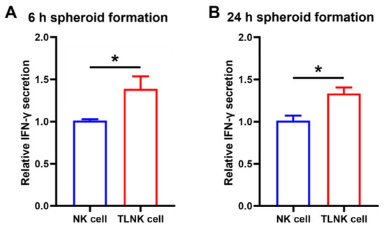 Figure 6. IFN-γ secretion in TLNK cells after (A) 6 h and (B) 24 h of spheroid formation. All groups were treated with 1 µg/mL lipopolysaccharide (LPS) for 24 h for cytokine inducement. IFN-γ secretion was detected by ELISA and the data are expressed as mean ± standard deviation (SD) based on a triplicate measurement. (* p < 0.05).