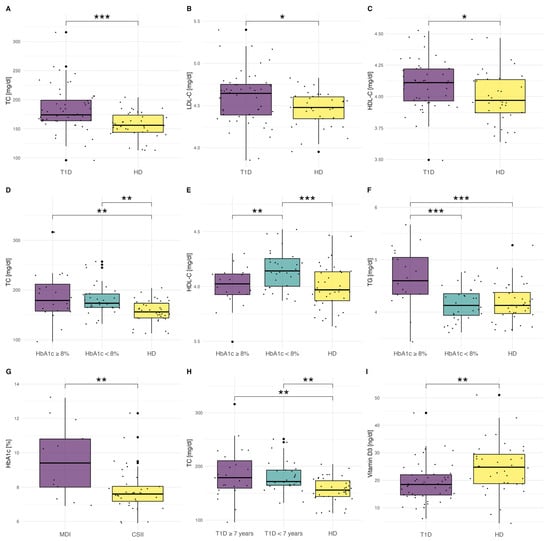 Clinical characteristics of patients. (A–C): The comparison of TC, LDL-C, and HDL-C levels between the T1D group and healthy individuals. LDL-C and HDL-C were normalized using logarithmic transformation and presented as normally distributed log-transformed data. (D–F): Level of lipids: TG, HDL-C, and TC in healthy control (n = 39) and T1D patients divided into two groups: HbA1c < 8% (n = 32) and HbA1c ≥ 8% (n = 20). The results are presented as mean ± SD. HDL-C and TG were normalized using logarithmic transformation and presented as normally distributed log-transformed data. (G): The difference in HbA1c level in patients with T1D treated with MDI (n = 13) and CSII (n = 39) therapy. (H): The level of TC in healthy control (n = 39) and T1D patients divided into two groups: T1D ≥ 7 years (n = 32) and T1D < 7 years (n = 20). The differences in LDL-C and HDL-C were not statistically significant. (I): The comparison of Vitamin D levels between T1D and HD groups. The results are presented as mean ± SD. Significance was calculated using the ANOVA test with subsequent post-hoc analysis of contrasts. Significant results are marked with * (p < 0.05), ** (p < 0.01), or *** (p < 0.001). Dots show the distribution of data.