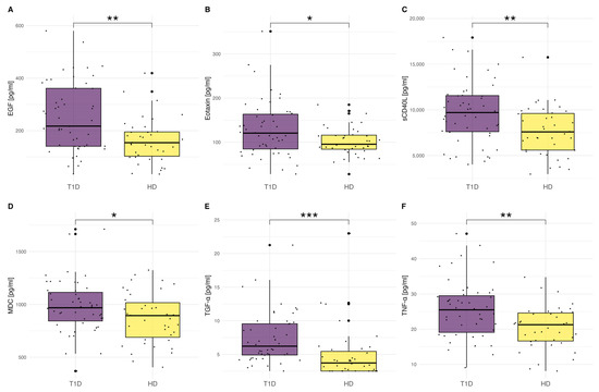 (A–F) The comparison of cytokines, chemokines, and growth factor levels between the T1D patients (n = 51) and the control group (n = 39). The significance was calculated using ANOVA with subsequent post-hoc analysis of contrasts. In the case of the TGF-α level, the Kruskal–Wallis test with post-hoc Wilcoxon test was used due to the lack of normal distribution of variables. Significant results are marked with * (p < 0.05), ** (p < 0.01), or *** (p < 0.001). Dots show the distribution of data.