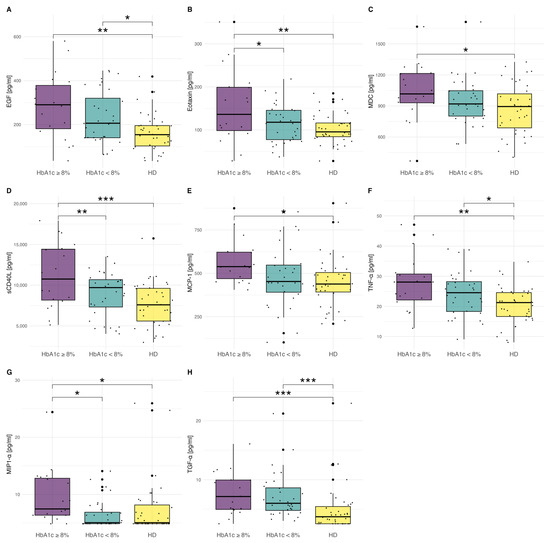 (A–H) Concentrations of cytokines in T1D patients with HbA1c ≥ 8% (63.9 mmol/L), (n = 20), HbA1c < 8% (n = 32), and in the HD group. The significance was calculated using ANOVA with subsequent post-hoc analysis of contrasts. The results are presented as mean ± SD. In the case of MIP-1α and TGF-α, the significance was calculated using the Kruskal–Wallis test with the post-hoc Wilcoxon test due to the lack of normal distribution of variables. Significant results are marked with * (p < 0.05), ** (p < 0.01), or *** (p < 0.001). Dots show the distribution of data.