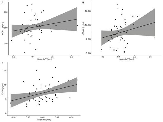 (A–C). Statistically significant correlations between cytokine concentrations [pg/mL] and mean carotid IMT [mm] in T1D patients. Correlations between measured parameters were analyzed using Spearman’s rank correlation. The grey region denotes the 95% confidence of interval. Dots show the distribution of data.