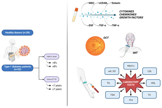 The whole study group consisted of 52 subjects affected with T1D and 39 healthy volunteers (control) matched by age and gender. The group of T1D patients was further divided into subgroups based on the duration of the disease (<7 years and ≥7 years) and metabolic control assessed by the HbAlc level (<8% and ≥8%) (Figure 5). In the study we included patients who were under the care of the Clinic of Pediatrics, Diabetology, and Endocrinology at the University Clinical Center in Gdansk, Poland. Inclusion criteria were those who were diagnosed with T1D according to the International Society for Pediatric and Adolescent Diabetes criteria [62], aged 8–18 years and had a diabetes duration of more than four years. Exclusion criteria included diabetic ketoacidosis at the moment of recruitment to the study, ongoing infection, uncompensated celiac disease, hypothyroidism or other endocrine disorders, chronic respiratory, and renal diseases, as well as neurological and immunological disorders.