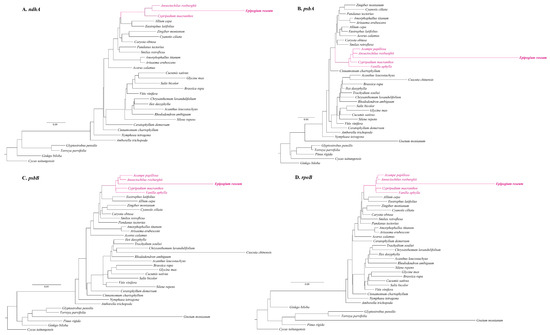 - Schelkunov, M.I.; Shtratnikova, V.Y.; Nuraliev, M.S.; Selosse, M.A.; Penin, A.A.; Logacheva, M.D. Exploring the limits for reduction of plastid genomes: A case study of the mycoheterotrophic orchids Epipogium aphyllum and Epipogium roseum. Genome Biol. Evol. 2015, 7, 1179–1191. [Google Scholar] [CrossRef]