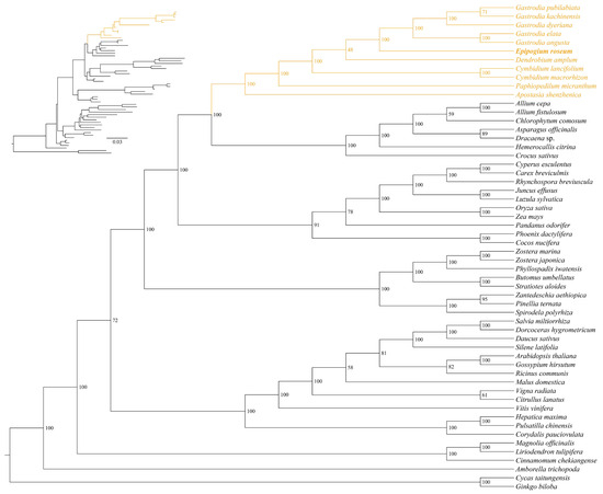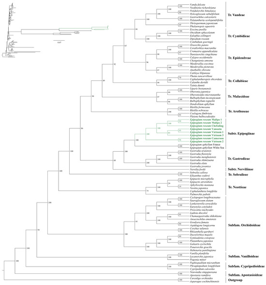 - Liu, D.K.; Tu, X.D.; Zhao, Z.; Zeng, M.Y.; Zhang, S.; Ma, L.; Zhang, G.Q.; Wang, M.M.; Liu, Z.J.; Lan, S.R.; et al. Plastid phylogenomic data yield new and robust insights into the phylogeny of Cleisostoma–Gastrochilus clades (Orchidaceae, Aeridinae). Mol. Phyl. Evol. 2020, 145, 106729. [Google Scholar] [CrossRef]