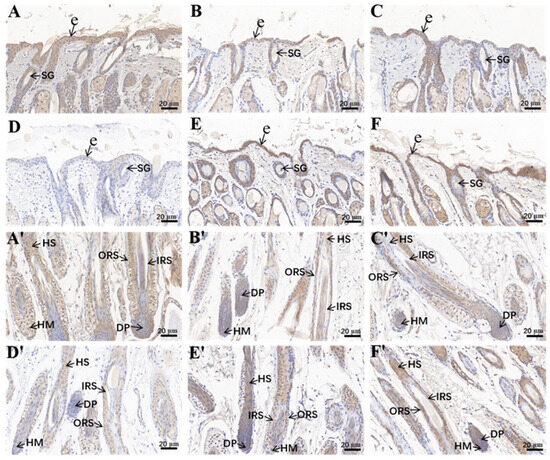 Immunohistochemical staining of Hoxc13 at different stages of skin hair follicle cycle development (40×). A(A′)–F(F′): six groups of immunohistochemical staining at day 1, 30, 60, 90, 180, and 270, in that order. (A,A′) are the same sample from the same period, (A) is the upper part of the hair follicle, (A′) is the lower part of the hair follicle. All similarly numbered samples that follow are the same sample. ORS: outer root sheath; IRS: inner root sheath; DP: dermal papilla; HM: hair matrix; HS: hair shaft; e: epidermis; SG: sebaceous glands.