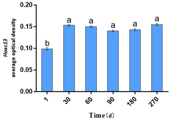 AOD values of Hoxc13 at different stages of hair follicle cycle development in the skin. The data are presented as mean ± standard error (S.E.). Different letters indicate significant differences between ages (p < 0.05).