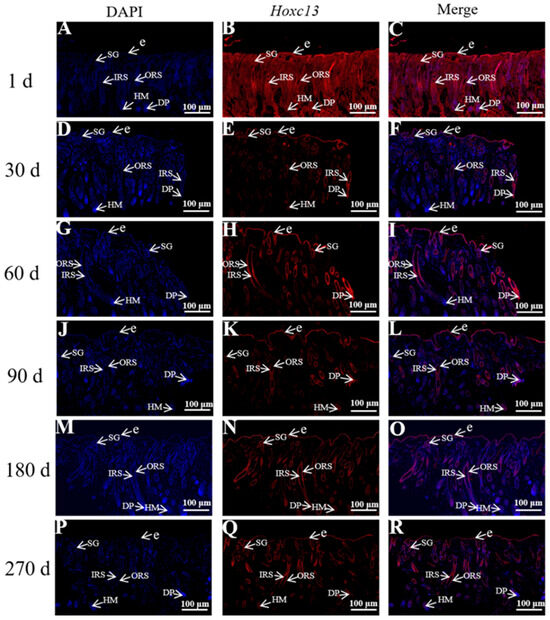 Immunofluorescence staining of Hoxc13 at different stages of skin follicle cycle development (10×). (A–C): 1 day; (D–F): 30 days; (G–I): 60 days; (J–L): 90 days: (M–O): 180 days; (P–R): 270 days. The blue tissue in the figure shows DAPI-labeled nuclear fluorescence staining and the red tissue shows fluorescence staining of Hoxc13. ORS: outer root sheath; IRS: inner root sheath; DP: dermal papilla; HM: hair matrix; e: epidermis; SG: sebaceous gland.